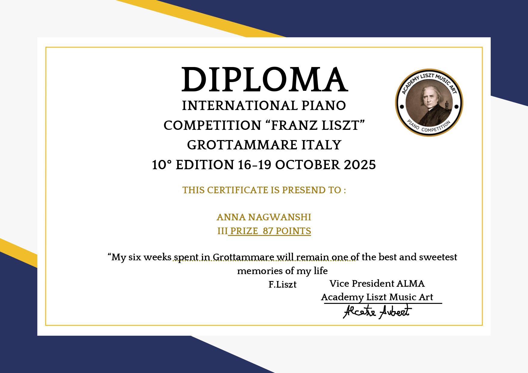 I am delighted to share a new milestone in the season 2025/2026 - I was rewarded the III. Prize (87 points) in International Piano Competition "Franz Liszt" in Grottammare Italy 10° edition 16-19 October 2025. I am very happy and honored to have been able to share my music with new people and gain new experience. I am grateful to everyone who was a part of the organisation and was helping during the whole process. 🎹 🎶🎼✨Be the first to read what's new!